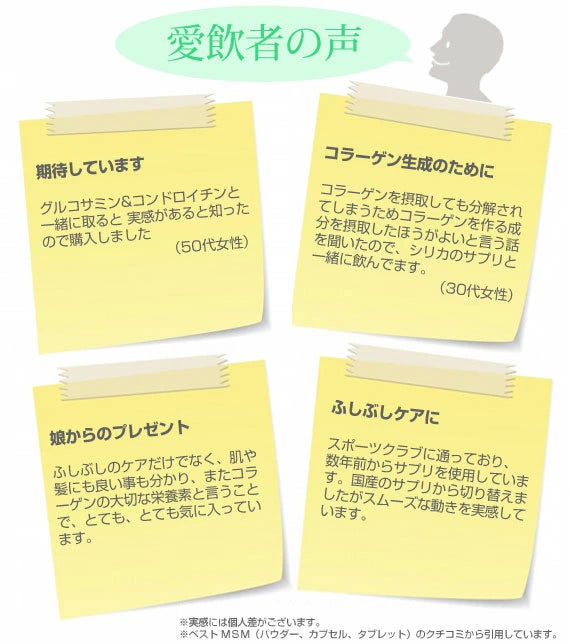 MSMはコラーゲンの重要な構成要素です。MSMを補給することで、コラーゲンの効率的な合成に役立つと言われています。
